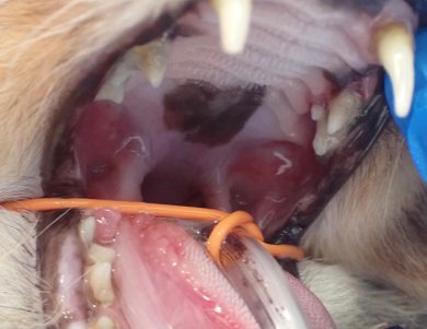 犬での口腔内腫瘍の発生は比較的多く、全腫瘍の6%に発生しています。猫においては全腫瘍の3%に報告されています。犬では3種類の悪性腫瘍(悪性黒色腫、扁平上皮癌、線維肉腫)、1種類の良性腫瘍(歯原性腫瘍:旧線維腫性エプリス)が多く発生しています。猫においては悪性腫瘍である扁平上皮癌は60%占めていると言われています。
